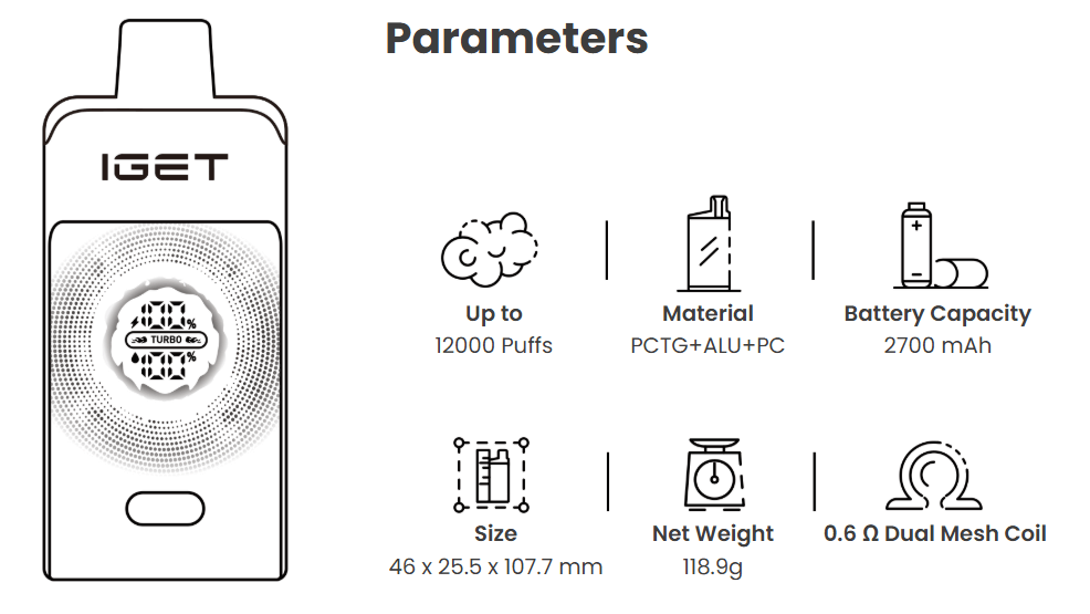 Perfectly balanced with a solid 118.9g weight, the IGET One offers both durability and a premium feel, it's designed for vapers who demand performance without compromise.